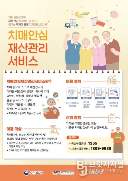 브릿지저널 김경미 기자 | 보건복지부는 4월 22일부터 ‘치매안심재산관리서비스 시범사업’을 실시한다고 밝혔다. 주요 대상은 치매, 경도인지장애 등으로 인해 경제적 학대 위험이 있는 기초연금수급자이며, 국민연금공단 7개 지역본부*에서 상담 받을 수 있다.