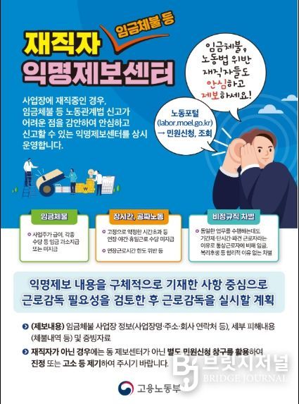 브릿지저널 정보영 기자 | 고용노동부는 ‘숨어있는 체불’을 선제적으로 청산하고 포괄임금 오남용으로 인한 “공짜 노동”을 근절하기 위해 「재직자 익명제보 사업장 근로감독」을 4월 22일부터 약 2개월간 진행한다고 밝혔다.