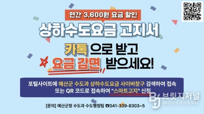 브릿지저널 정보영 기자 | 예산군은 수도요금을 카카오톡 알림톡으로 간편하게 확인하고 납부할 수 있는 ‘스마트고지 서비스’ 이용을 늘리기 위해 홍보를 강화한다고 밝혔다.