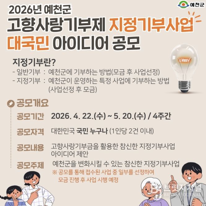 브릿지저널 정보영 기자 | 예천군은 기부자가 사업 목적에 공감하고 직접 수혜 대상을 결정하는 ‘고향사랑 지정기부제’를 적극 도입하기로 하고, 그 첫걸음으로 4월 22일부터 5월 20일까지 '2026년 예천군 고향사랑기부제 지정기부사업 아이디어 공모전'을 열어 국민들의 참신한 제안을 받는다.