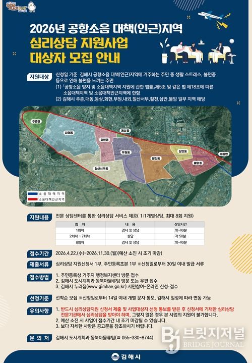 브릿지저널 김경미 기자 | 김해시는 공항소음 대책(인근)지역 주민을 대상으로 심리상담 지원사업 참여자를 모집한다고 22일 밝혔다.