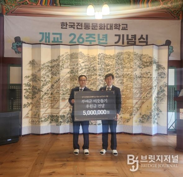 브릿지저널 정보영 기자 | 한국전통문화대학교 교직원일동은 개교 26주년 기념행사에서 저소득 가구의 초·중·고 학생 장학금으로 사용해 달라며 이웃돕기 성금 500만 원을 부여군에 기탁했다고 22일 밝혔다.