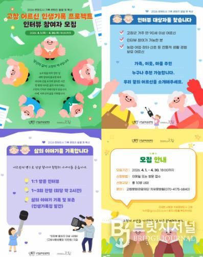 브릿지저널 윤나영 기자 | 고창문화도시센터는 지역 어르신들의 삶과 지혜를 기록으로 남기기 위한 ‘고창 어르신 인생기록 프로젝트’ 인터뷰 참여자를 오는 4월 30일까지 모집한다고 밝혔다.