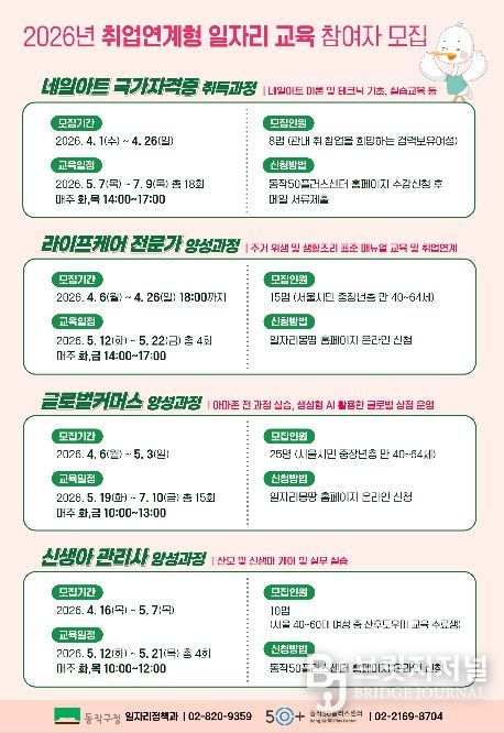 브릿지저널 김경미 기자 | 동작구가 취업을 희망하는 주민의 실무 역량 강화와 현장 진출 지원을 위해 ‘취업연계형 일자리사업’을 확대하고 신규 참여자를 모집한다고 밝혔다.