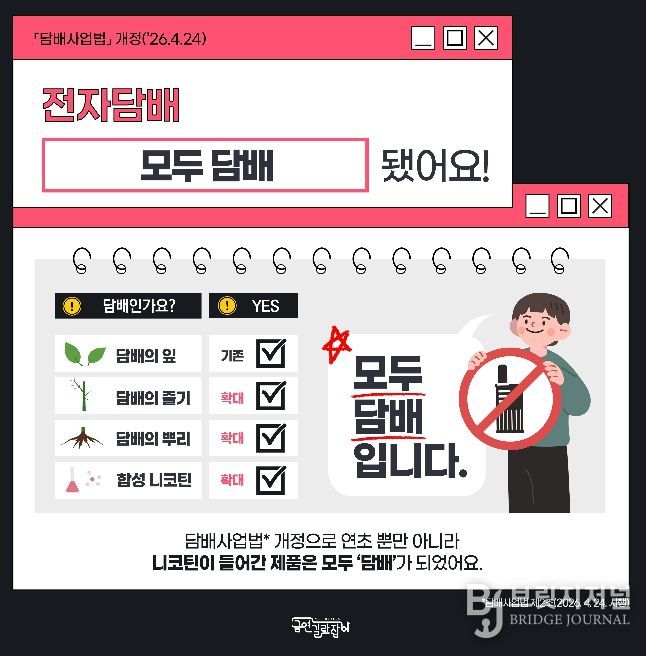 브릿지저널 김경미 기자 | 서울 강서구는 오는 24일부터 시행되는 담배사업법 개정에 따라 전자담배를 포함한 모든 담배 제품에 대한 단속을 강화한다고 밝혔다.