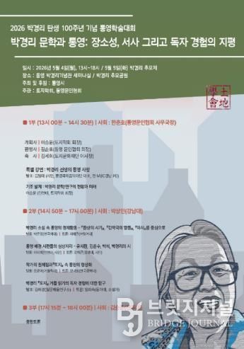 브릿지저널 김경미 기자 | 통영시는 한국 문학의 거목 박경리 선생 탄생 100주년을 맞아 오는 5월 4일 오후 1시 박경리기념관 세미나실에서 통영문인협회와 토지학회가 공동 주관하는 ‘2026 박경리 탄생 100주년 기념 통영학술대회’를 개최한다.