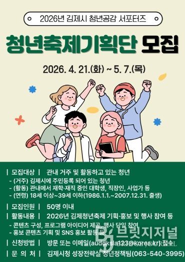브릿지저널 윤나영 기자 | 김제시는 청년이 주도하는 축제 기획을 통해 지역 청년 참여를 확대하고 활력을 불어넣고자 '청년축제기획단(김제시 청년공감 서포터즈)'을 모집한다고 밝혔다.