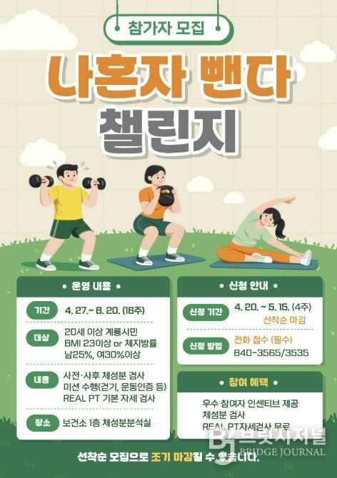 브릿지저널 정보영 기자 | 충남 계룡시는 시민들의 건강한 체중 감량과 올바른 운동 습관 형성을 위해 오는 5월 15일까지 ‘나혼자 뺀다’ 챌린지 참여자 300명을 선착순으로 모집한다고 밝혔다.