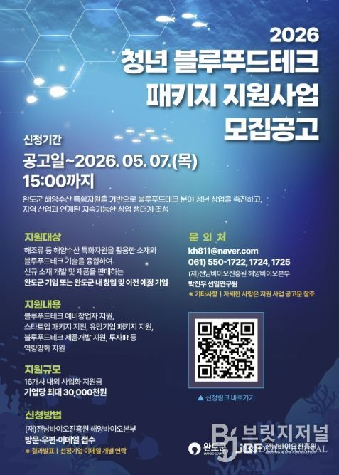 브릿지저널 김경미 기자 | 완도군은 지역의 해양 수산 자원을 고부가가치로 전환하고 청년 창업을 돕기 위해 ‘2026년도 청년 블루푸드테크 패키지 지원 사업’ 참가자를 모집한다.