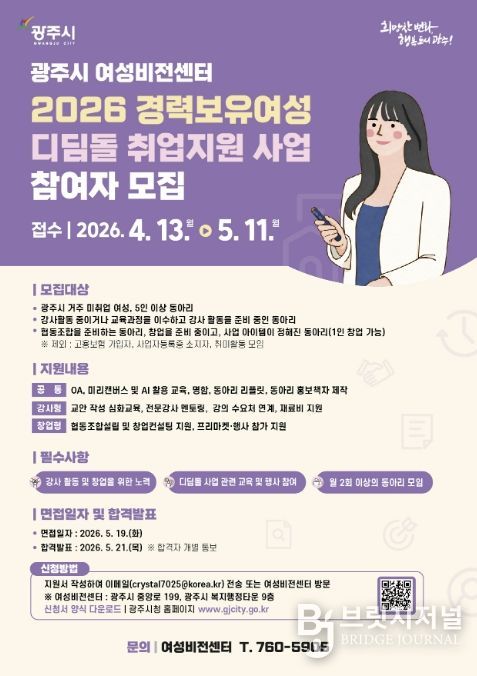 브릿지저널 김경미 기자 | 광주시는 지역 내 경력보유여성의 사회 재진출과 취업 역량 강화를 위해 ‘2026 경력보유여성 디딤돌 취업 지원 사업’ 참여자를 오는 5월 11일까지 모집한다고 22일 밝혔다.