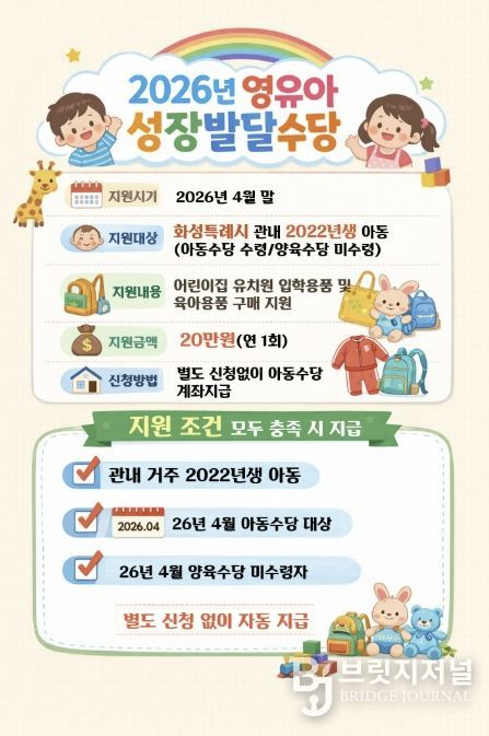 브릿지저널 김경미 기자 | 화성특례시는 어린이집 및 유치원 입학 초기 영유아 가정의 양육 부담을 덜고 아동의 건강한 성장을 지원하기 위해 ‘2026년 영유아 성장발달수당’을 지급한다고 밝혔다.