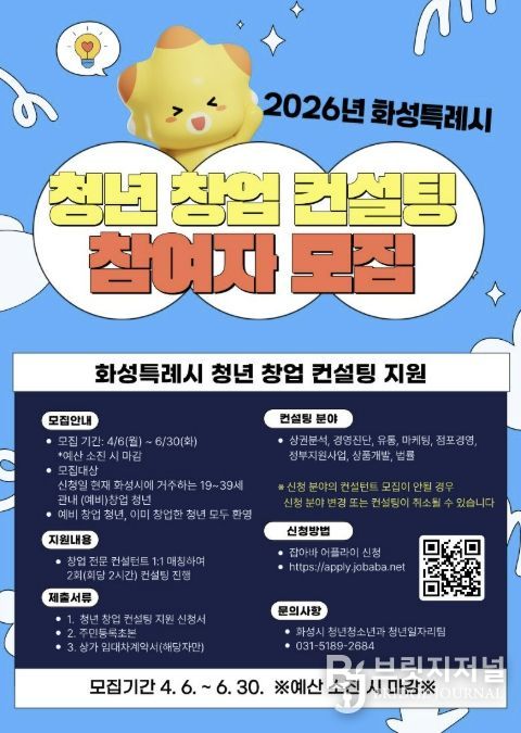브릿지저널 김경미 기자 | 화성특례시는 오는 6월 30일까지 ‘2026년 청년 창업 컨설팅 지원사업’ 참여자를 모집한다.