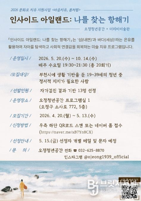 브릿지저널 김경미 기자 | 부천시는 오정청년공간에서 정서적 고립감을 겪는 청년을 위한 미술 치유 프로그램 ‘인사이드 아일랜드: 나를 찾는 항해기’ 참여자를 5월 13일까지 모집한다.