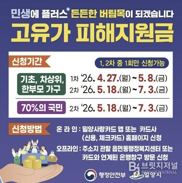 브릿지저널 김경미 기자 | 경남 밀양시는 고유가로 인한 시민 부담 완화를 위해 4월 27일부터 7월 3일까지 ‘고유가 피해지원금’ 신청을 접수한다.