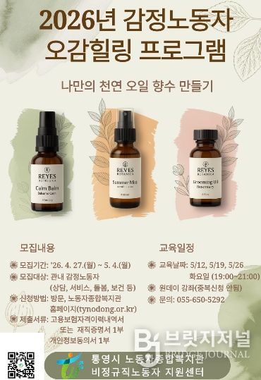 브릿지저널 김경미 기자 | 통영시는 관내 서비스업, 돌봄, 보건, 상담 등 다양한 직군의 감정노동자들의 마음 치유와 휴식에 초점을 맞춰 ‘2026년 감정노동자 오감힐링 프로그램’을 통영시노동자종합복지관에서 운영한다고 22일 밝혔다.