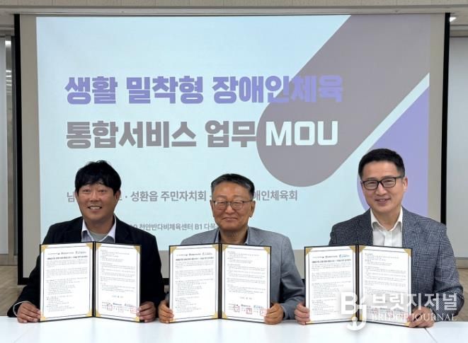 브릿지저널 정보영 기자 | 천안시장애인체육회는 22일 천안반다비체육센터에서 성환읍 주민자치회, 남서울대학교와 ‘생활밀착형 장애인체육 통합서비스 구축을 위한 업무협약’을 체결했다.