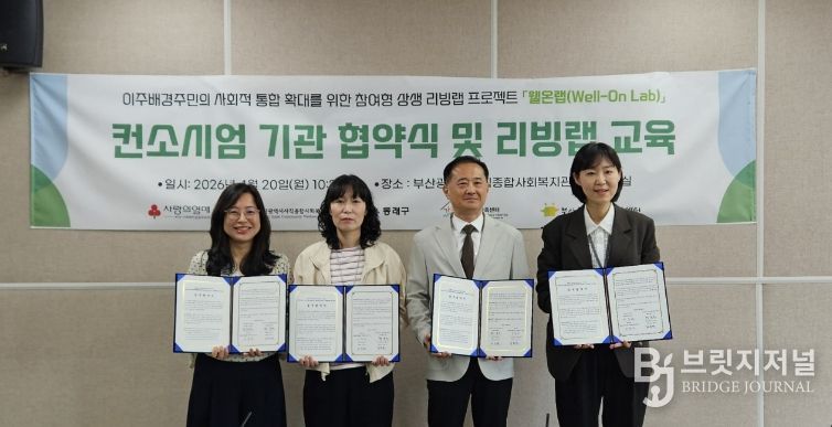 브릿지저널 윤나영 기자 | 부산 동래구는 사직종합사회복지관(관장 황승호)이 지난 20일 이주배경주민의 사회적 통합 확대를 위한 소셜리빙랩 프로젝트 ‘웰온랩(Well-on Lab)’의 성공적인 추진을 위해 동래구청 및 유관 기관과 업무협약을 체결했다고 밝혔다.