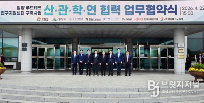 브릿지저널 김경미 기자 | 경상남도는 22일 밀양시청에서 ‘밀양 푸드테크 연구지원센터 구축’을 위한 산·관·학·연 협력 업무협약(MOU)을 체결하고, 농림축산식품부가 추진하는 105억 원 규모의 ‘푸드테크 연구지원센터 구축사업(스마트유통 분야)’ 공모 준비에 본격 착수했다.