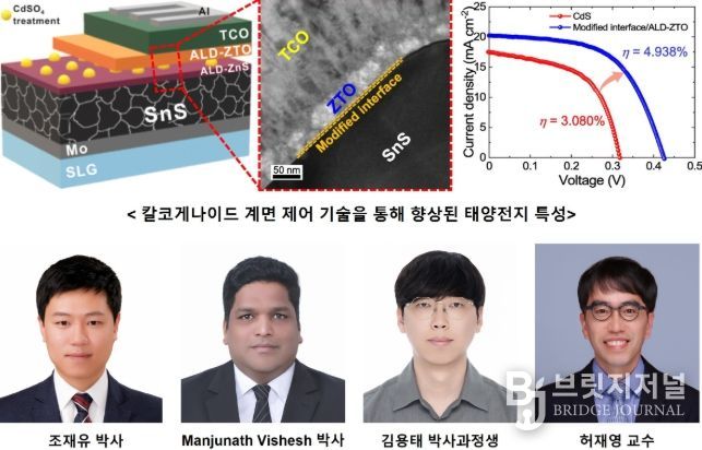 브릿지저널 김경미 기자 | 전남대학교 연구진이 친환경 소재로 주목받아온 황화주석(SnS) 태양전지의 최대 약점이었던 효율 한계를 계면 제어 기술로 극복하며, 상용화 가능성을 한 단계 끌어올렸다.