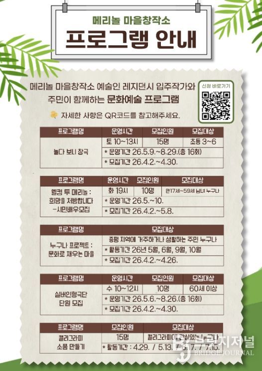 이와 함께 주민이 마을 기반 문화프로그램을 직접 기획·운영하는 ‘누구나 프로젝트 : 문화로 채우는 마을’, 60세 이상을 대상으로 한 ‘실버인형극단’, 생활 속 예술 체험을 돕는 ‘캘리그라피 소품 만들기’ 등 다양한 참여형 프로그램이 운영된다.