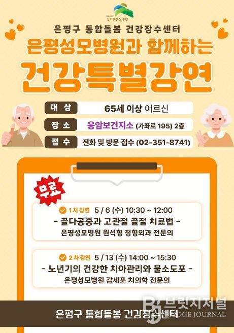 브릿지저널 김경미 기자 | 서울 은평구는 다음 달 6일과 13일 구민의 건강한 노후생활을 지원하기 위해 65세 이상 어르신을 대상으로 ‘건강특별강연’을 운영한다고 밝혔다.