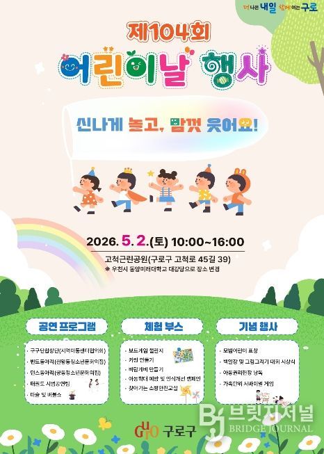 브릿지저널 김경미 기자 | 구로구가 제104회 어린이날을 맞아 오는 5월 2일 고척근린공원에서 어린이와 가족, 지역주민이 함께 즐길 수 있는 ‘어린이날 행사’를 개최한다.