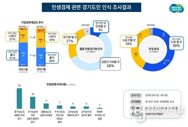 정두석 경기도 기획조정실장은 “가정 경제 형편이 두 달 만에 급격히 나빠졌다는 조사 결과는 현재 민생 현장의 어려움을 보여준다”며 “추경 예산이 빠르게 집행될 수 있도록 도의회와 긴밀히 협의하여 고유가와 고물가로 고통받는 도민들의 부담을 덜어드리도록 하겠다”고 밝혔다.