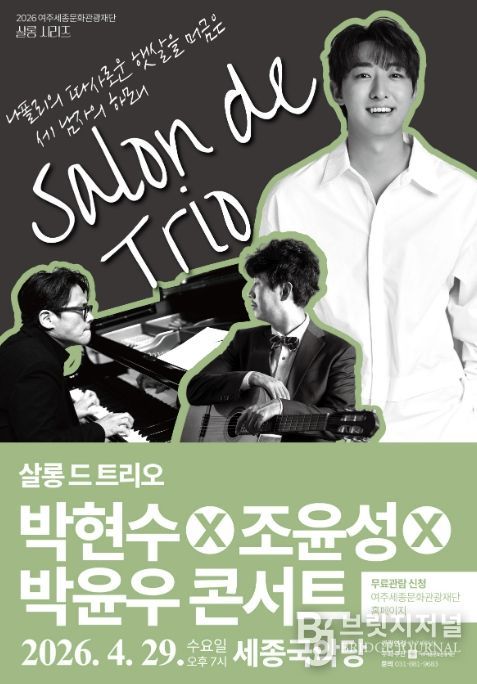 브릿지저널 김경미 기자 | 여주세종문화관광재단이 오는 29일, 문화가 있는 날을 맞아 2026년 특별기획 살롱 시리즈의 세 번째 무대 '살롱 드 트리오 박현수X조윤성X박윤우 콘서트'를 세종국악당에서 개최한다.