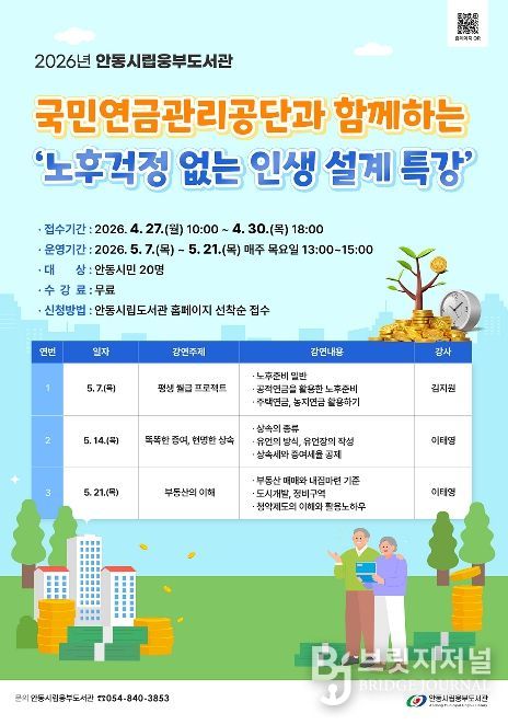 브릿지저널 정보영 기자 | 안동시립웅부도서관은 지역 주민들에게 건강하고 안정적인 노후생활을 지원하기 위해 부동산, 연금, 상속 등 행복한 노후 설계의 핵심 노하우를 전하는 ‘노후 걱정 없는 인생 설계’ 특강을 운영한다고 23일 밝혔다.