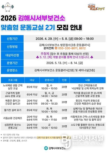 브릿지저널 김경미 기자 | 김해시서부보건소에서 오는 29일부터 5월 8일까지 『2026년 맞춤형 운동교실 2기』 신규 참여자를 모집한다.