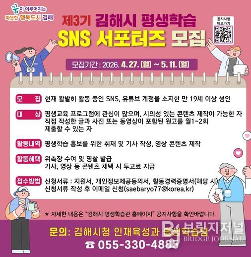 브릿지저널 김경미 기자 | 김해시는 27일부터 5월 11일까지 제3기 김해시 평생학습 SNS 서포터즈를 모집한다.