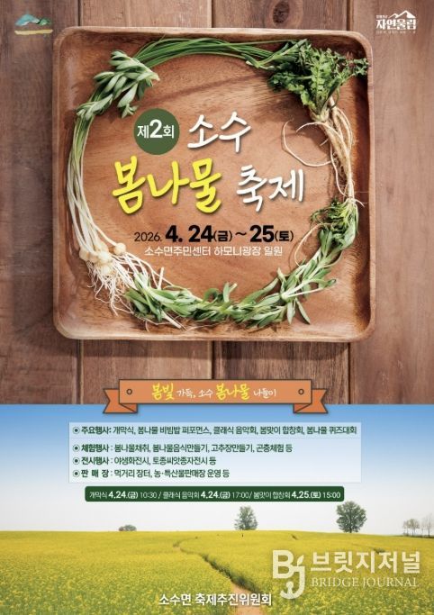브릿지저널 김경미 기자 | 충북 괴산군 소수면축제추진위원회는 오는 24일부터 25일까지 이틀간 소수면 하모니광장 일원에서 ‘제2회 소수봄나물축제’를 연다.