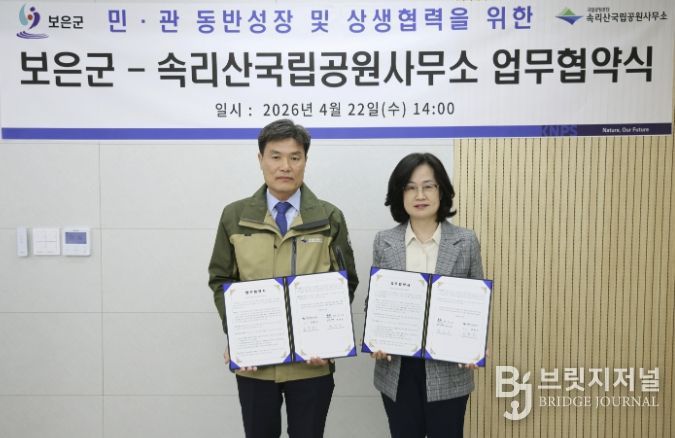 브릿지저널 김경미 기자 | 충북 보은군은 지난 22일 속리산국립공원사무소와 지역 중소기업의 동반성장과 상생협력 사업 추진을 위한 업무협약을 체결했다.