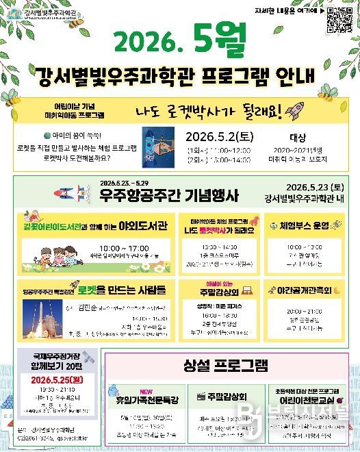 브릿지저널 김경미 기자 | 서울 강서구 강서별빛우주과학관은 5월 어린이날과 우주항공주간을 맞아 어린이부터 성인까지 온 가족이 함께 우주의 신비를 즐길 수 있는 특별 프로그램을 운영한다.