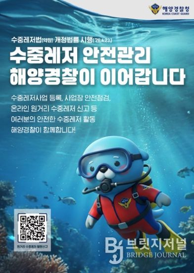 브릿지저널 김경미 기자 | 중부지방해양경찰청은 「수중레저활동의 안전 및 활성화 등에 관한 법률」(약칭. 수중레저법)을 시행(4.23.)하며 수중레저 안전관리를 강화한다고 밝혔다.