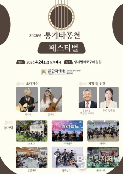 브릿지저널 윤나영 기자 | (사)한국예총 홍천지회가 주관하는 2026 통기타 홍천 페스티벌이 오는 4월 24일 오후 4시 홍천 양지말화로구이 일원에서 열린다.