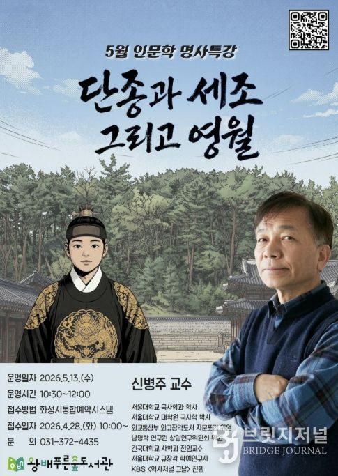 브릿지저널 김경미 기자 | 화성시문화관광재단 운영하는 왕배푸른숲도서관이 오는 5월 13일, 지역 주민들을 위해 역사학자 신병주 교수를 초청하여 5월 인문학 명사특강을 개최한다.