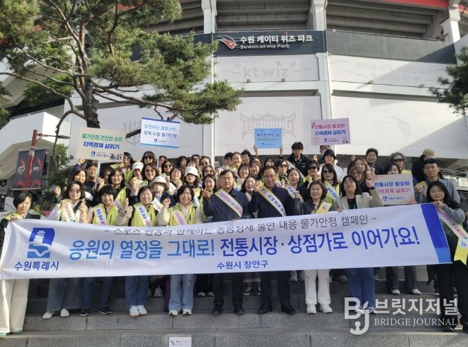 브릿지저널 김경미 기자 | 수원시 장안구는 지난 22일, 수원KT위즈파크 일대에서 야구관중을 대상으로 지역경제 활성화를 위한 캠페인을 추진했다. 이번 캠페인에는 장안구청장을 비롯해 관계 공무원과 물가모니터요원 등 20여 명이 참여했다.