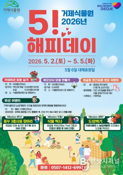 브릿지저널 김경미 기자 | 거제시농업기술센터는 오는 5월 2일부터 5월 5일까지 거제식물원 일원에서 특별행사 ‘거제식물원 5! 해피데이’를 운영한다고 밝혔다.