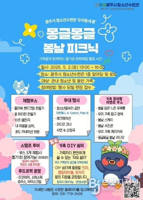 브릿지저널 김경미 기자 | 광주시 청소년수련관은 오는 5월 2일 오후 1시부터 수련관 1층 앞마당 및 로비에서 ‘2026년 우리동네 봄 몽글몽글 봄날 소풍’을 개최한다고 23일 밝혔다.