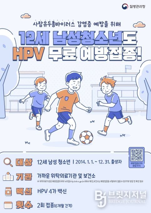 기존에는 여성청소년과 일부 저소득층 여성에게 제공되던 무료 접종이 12세 남성 청소년(2014년생) 대상으로 총 2회(6개월 간격) 무료 접종을 시작한다.