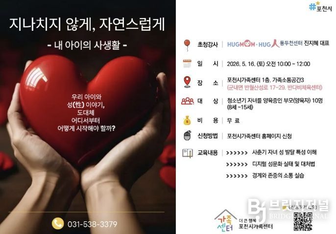 브릿지저널 김경미 기자 | 포천시 직영 더 큰 행복 포천시가족센터는 오는 21일부터 사춘기 자녀를 둔 양육자를 대상으로 부모 교육 프로그램 ‘지나치지 않게, 자연스럽게’의 참여자를 모집한다. 이번 교육은 5월 16일 오전, 포천시가족센터 가족소통공간(반다비체육센터 1층)에서 대면 강의로 진행된다.