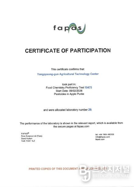 브릿지저널 김경미 기자 | 양평군은 영국 식품환경연구청(FERA)이 주관한 ‘2026년 잔류농약 국제비교숙련도 평가’에서 최고 수준의 분석능력을 인정받아 3년 연속 우수성을 입증했다고 21일 밝혔다.