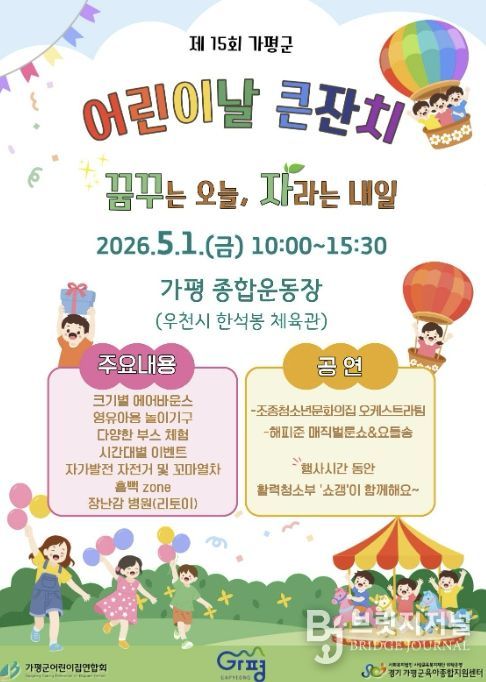 브릿지저널 김경미 기자 | 가평군은 오는 5월 1일 오전 10시 가평종합운동장에서 ‘제15회 가평군 어린이날 기념행사’를 개최한다. 가평군어린이집연합회와 가평군육아종합지원센터가 공동 주관하는 이번 축제는 기념행사와 공연, 놀이, 체험 부스 등 다채로운 프로그램으로 꾸며진다.
