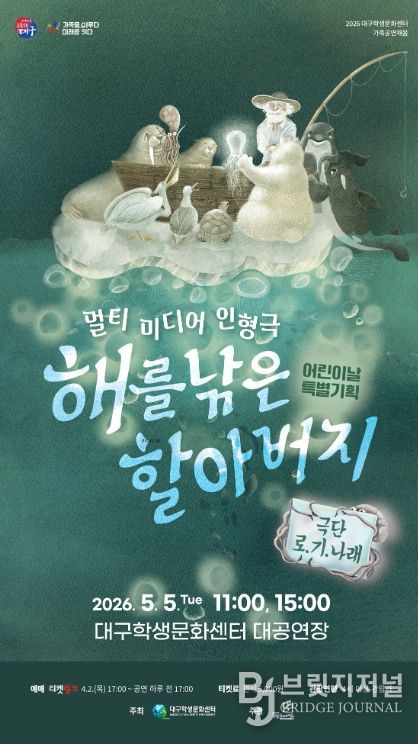 브릿지저널 김진석 기자 | 대구학생문화센터는 어린이날을 맞아 어린이와 가족 관객을 위한 특별 기획공연 '멀티미디어 인형극 해를 낚은 할아버지'를 오는 5월 5일 대공연장에서 선보인다.