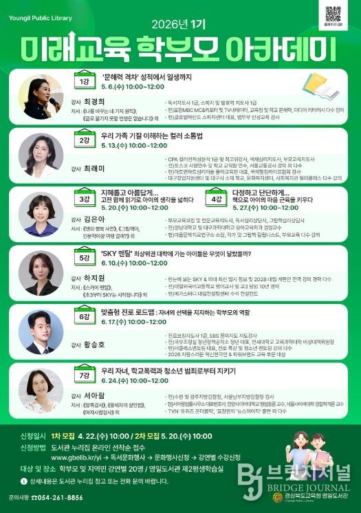 브릿지저널 정보영 기자 | 경상북도교육청 영일도서관은 오는 5월 6일부터 학부모 및 지역주민을 대상으로 ‘2026 1기 미래교육 학부모 아카데미’를 운영하고 수강생을 모집한다.