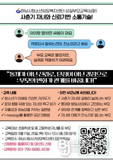 브릿지저널 김경미 기자 | 하남시 청소년상담 복지센터가 부모와 자녀 간 소통을 돕기 위한 부모교육 프로그램을 한층 강화한다. 특히 청소년기 자녀와의 대화에 어려움을 느끼는 부모들이 실제로 체감할 수 있는 교육으로 개편한 것이 특징이다.