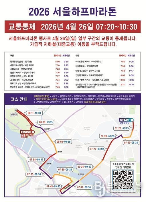 브릿지저널 김경미 기자 | 서울시는 4월 26일 오전 7시 30분 광화문광장을 출발해 여의도공원과 상암 월드컵공원으로 이어지는 ‘2026 서울하프마라톤대회’를 개최한다.