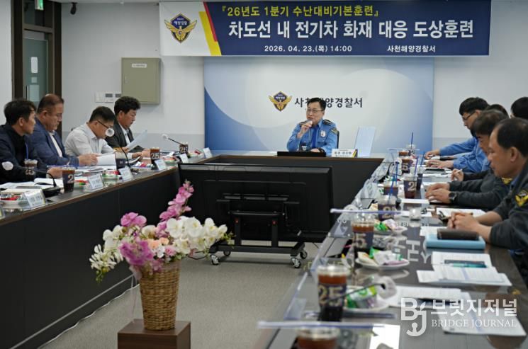 브릿지저널 김경미 기자 | 사천해양경찰서는 23일 도선 내 전기차 화재 상황을 대비하여 선제적 해양사고 예방과 신속한 구조 대응체계 확립을 위한 수난대비기본훈련을 실시했다고 밝혔다.
