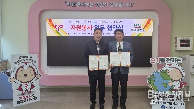 브릿지저널 윤나영 기자 | (사)군산시자원봉사센터(이사장 황진)는 4월 23일 군산시자원봉사센터 세미나실에서 호원대학교 호원사회봉사단(단장 서충길)과 지역사회 연계 봉사활동 활성화를 위한 업무협약(MOU)을 체결했다.